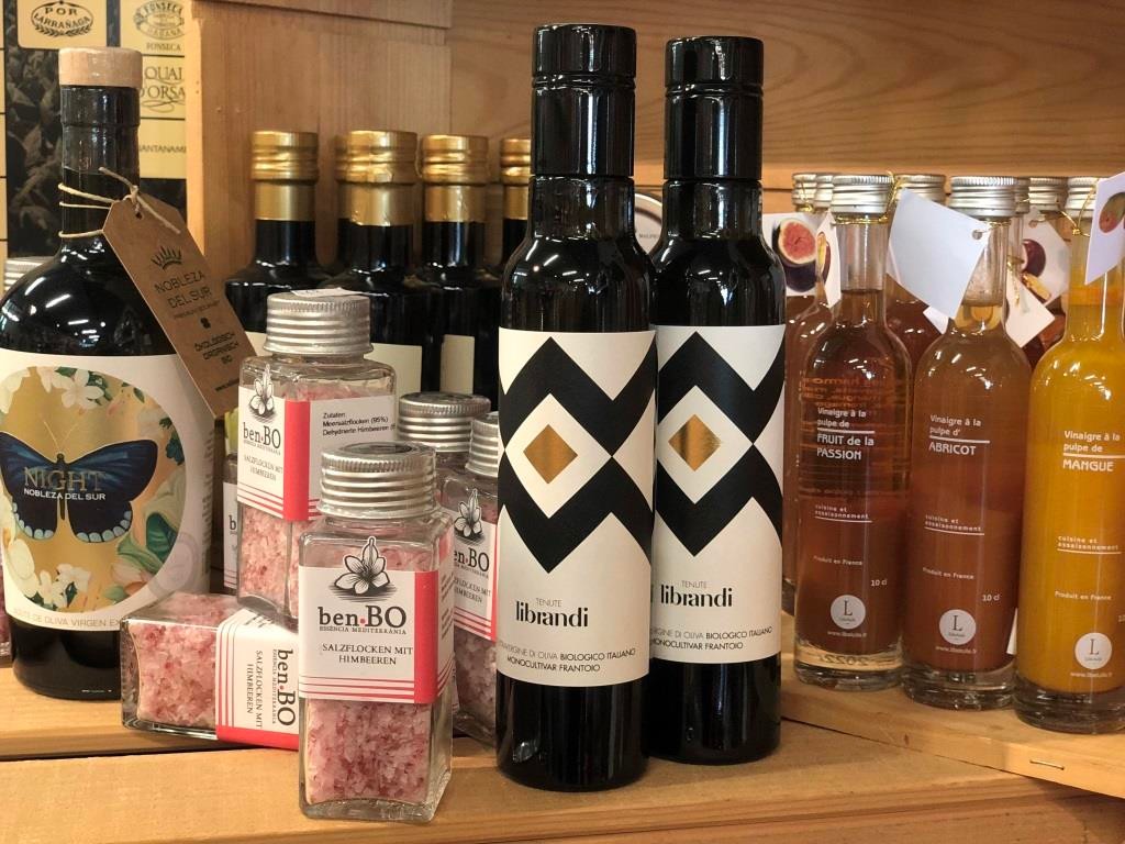 genüsslicher Feinkost an: hochwertige Olivenöle, Trüffelöl, verschiedene Sorten Aceto Balsamico, bunte Pasta, Risotto, Terrinen, Pesto, Sugo, gefüllte Peperoncini, feine Oliven, Kapern, eingelegter Knoblauch, Steinpilze, Mandeln, Erdnüsse, Grissini, Gourmet-Chips und Popcorn, Tartufi, Cantuccini und zahlreiche weitere saisonale Coméstibles.